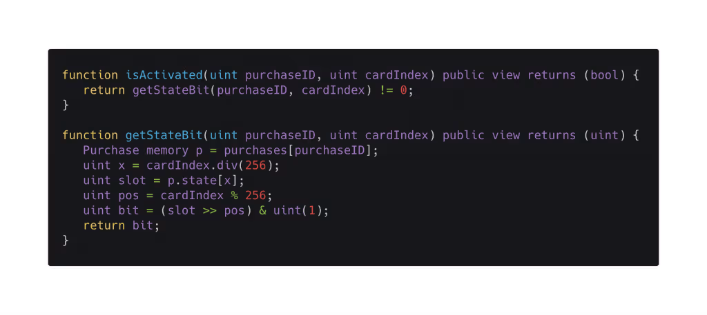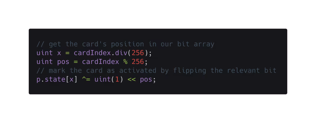 Activating cards one at a time requires us to keep a registry of which individual cards have been activated: our problem here devolves to the cheapest way of doing that. Well, the smallest unit available to us in the EVM is a single bit which can only represent two values — good enough for us! When a purchase is made, we allocate a uint256 array, where every bit represents whether or not a purchase has been activated. When a card is activated, we flip the bit which represents that card: