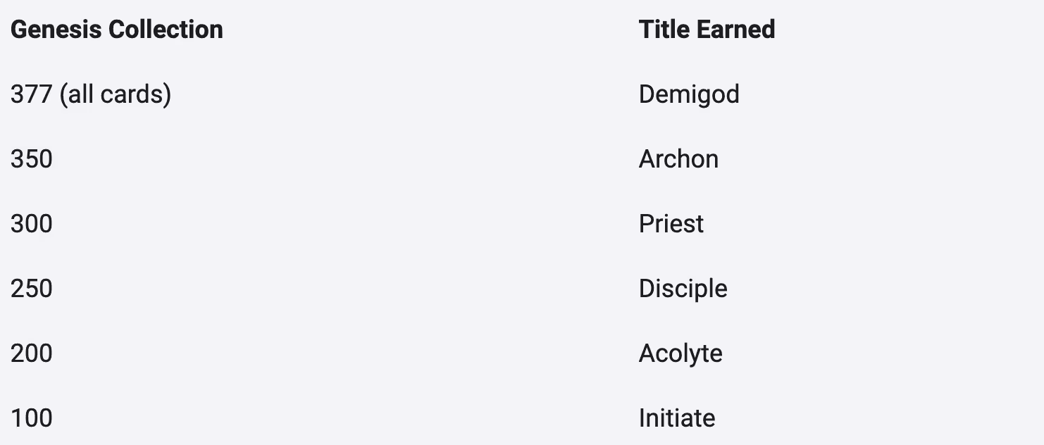 For those that have been around since our Genesis period, you’d likely be familiar with the current (and soon to be retired) system. Starting from Initiate and working its way all the way up to Demigod, the Collection Title system was designed to reflect the amount of unique Genesis cards in each mortal’s inventory. This could be seen on the website, in our Discord server, and even on our limited-edition Genesis Boards with the appearance of the board evolving dependent on the final Collection Title of the individual.