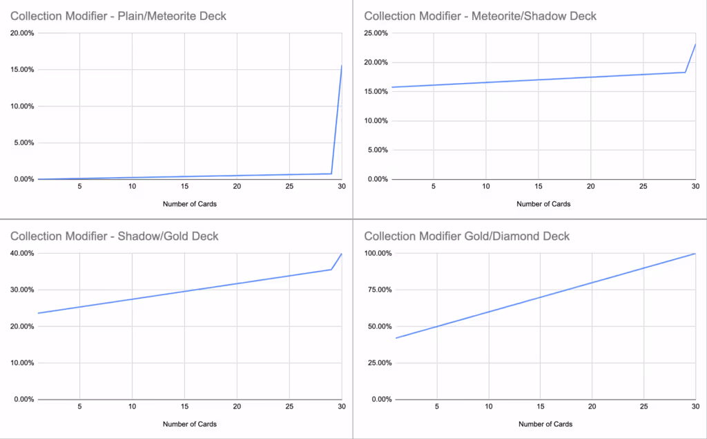 As you can see in these graphs, the rewards are significant for upgrading the Quality of the cards within your deck. While individual cards on their own might not significantly impact potential rewards, completing a full deck yields a large bonus to the rewards you can earn.