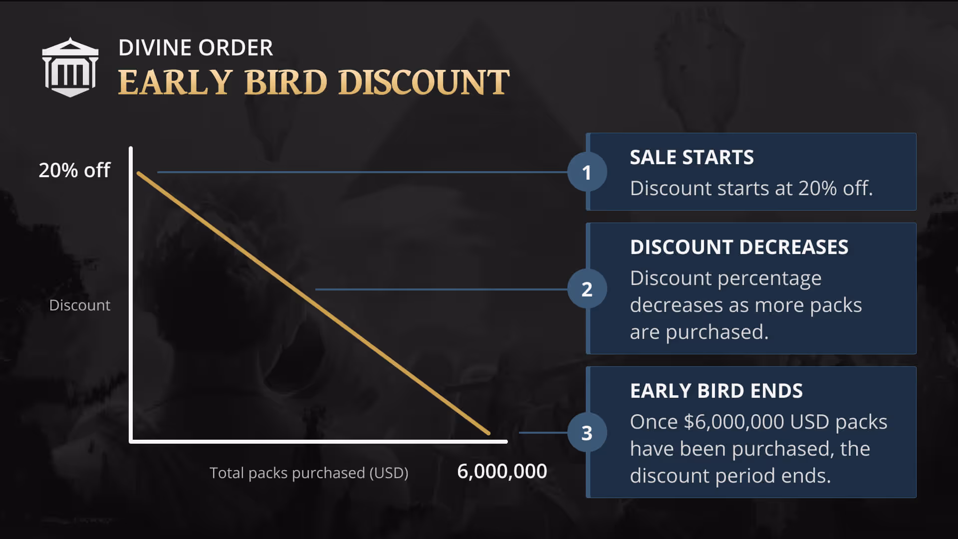 The Divine Order early-bird special will use a ramp price calculation to decrease the discount amount over the course of the offering. After the early-bird special ends, Divine Order packs will be sold at full price. To calculate the discount percentage at any given time, we'll be using the below calculation: