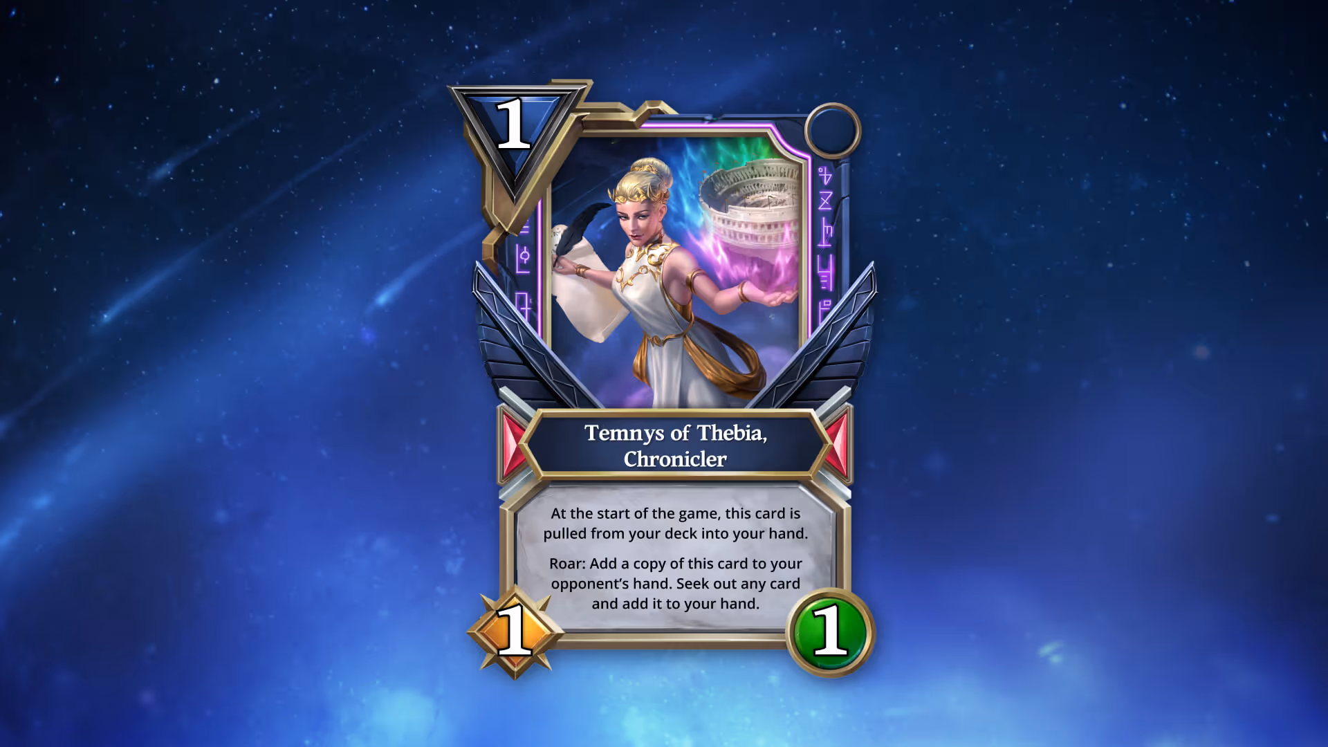 All Gods Unchained cards have a Rarity value. These are shown by the colored crystals on either side of a card’s nameplate. A gray crystal indicates a Common card, pale blue: a Rare card, purple: an Epic card, and gold means the gods must look favorably upon you, mortal, because you’ve landed yourself a Legendary card!
