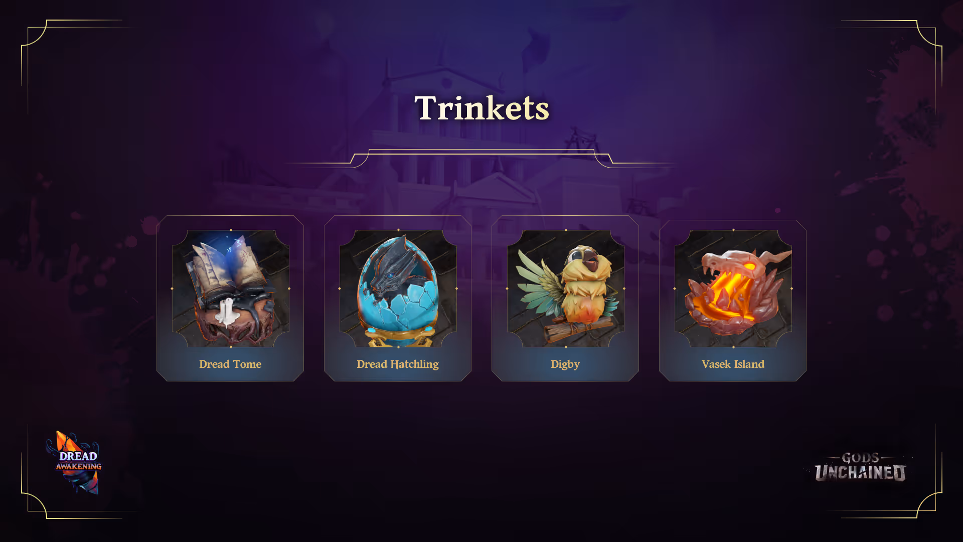 With the Dread Awakening release comes a set of brand new trinket cosmetics to be found and won! Some of them will be won by dedicated (or lucky) players who spend their time and effort braving the challenges of Sealed mode. Others will be available through engaging with other parts of the Gods Unchained ecosystem, earnt through community challenges and events.