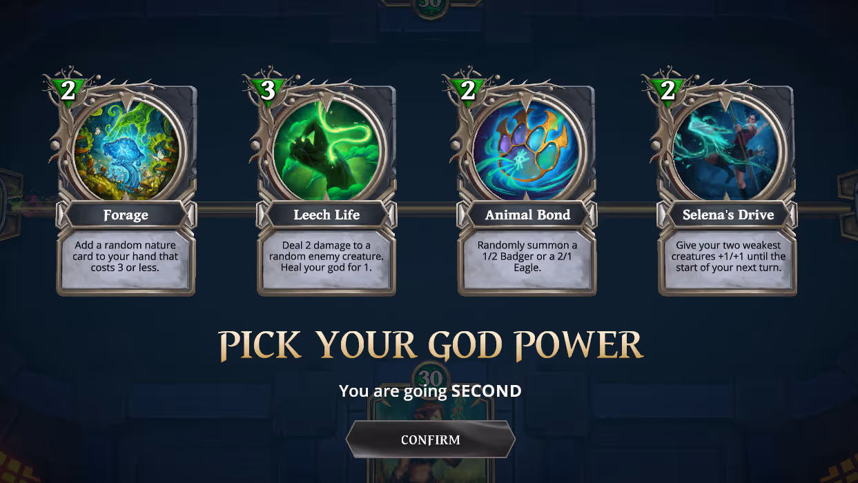 - Leech Life: Deal 2 damage to a random enemy creature. Heal your god for 1. (Cost: 3 mana.)