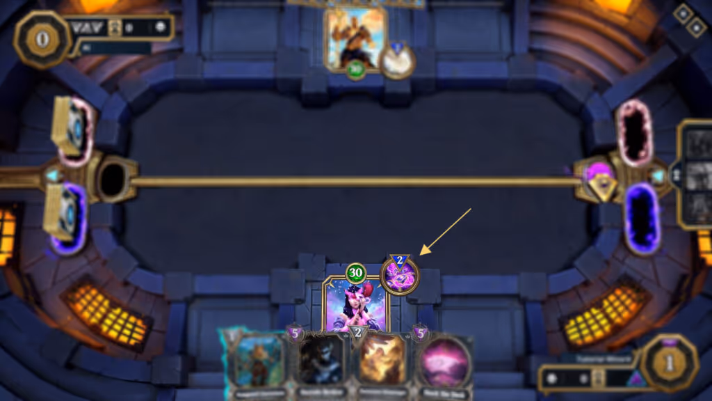 After choosing the card, it will always be available in the top right corner of your profile picture. You can also see the mana cost, and when hovering above the card, you can read the card text.