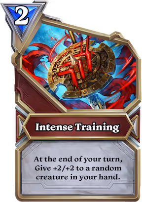 Intense Training: Mediocrity has no place on your side of the battlefield, heck, not even in your hand. For just two mana you can send your favorite random minion through its annual new year’s resolution. Why let it embarrass you in front of your opponent, when you can summon a mobile barracks to help them level up? In Auros’ camp we’re all for playing fast and loose with expendable creatures, but c’mon, everyone has standards.