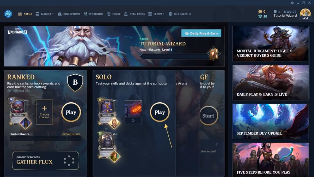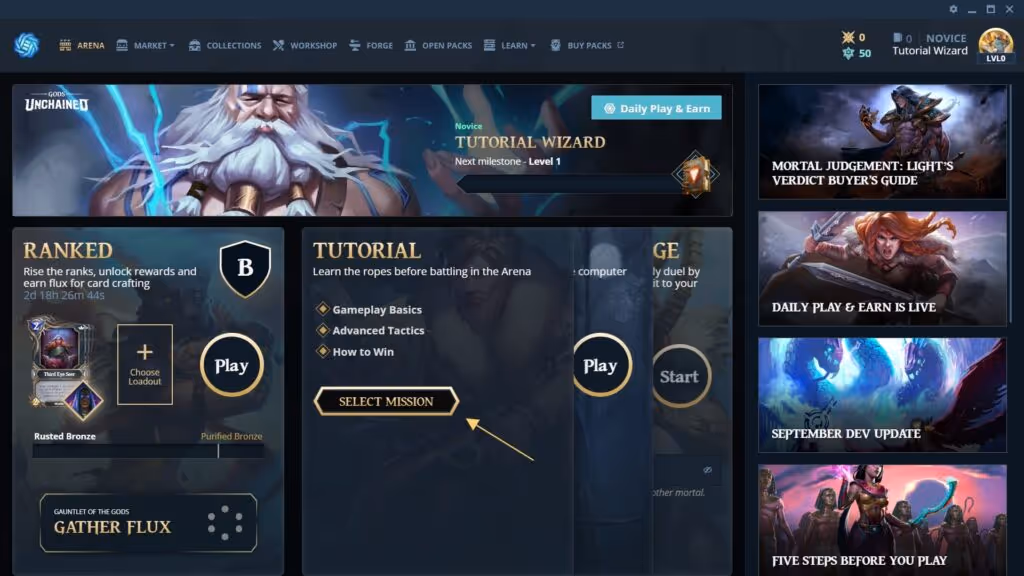 Click “Select Mission” in the Arena tab and jump right in. Currently, there are 2 tutorial missions available. Completing each mission will reward you with Card Packs. We strongly recommend you complete these missions when you begin your journey in Gods Unchained. You may not need the tutorial, but those Card Packs will surely come in handy *wink*
