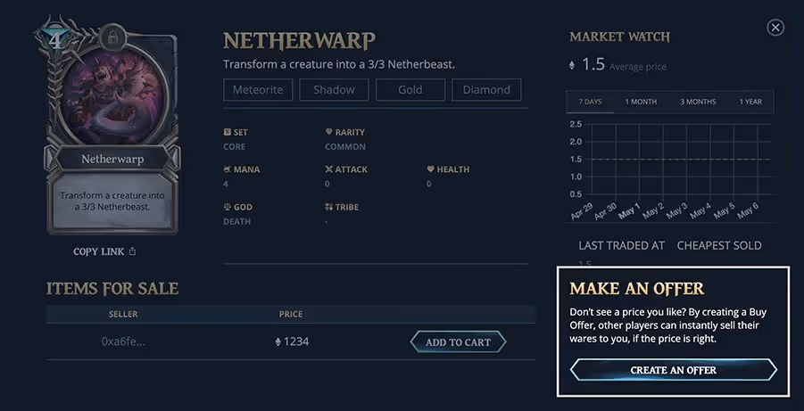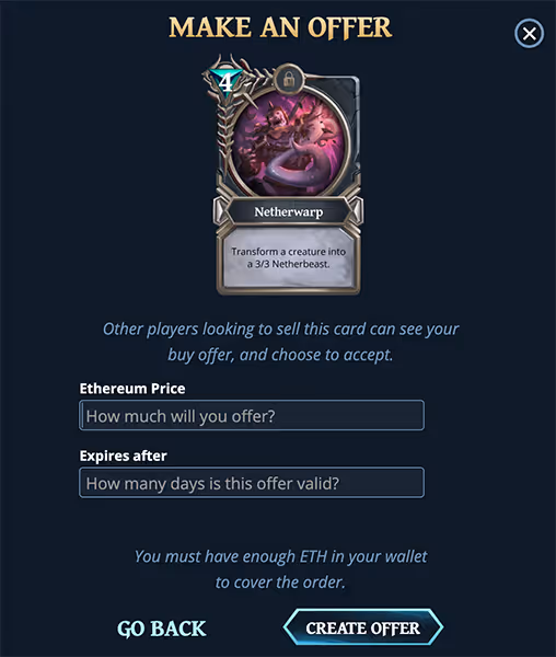 To do so, locate the item you are after in the marketplace (whether that’s a card, trinket, board or card back) and, once you click on it, you’ll see the “make an offer” option appear in the bottom right hand side.