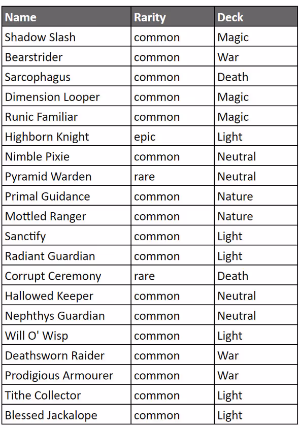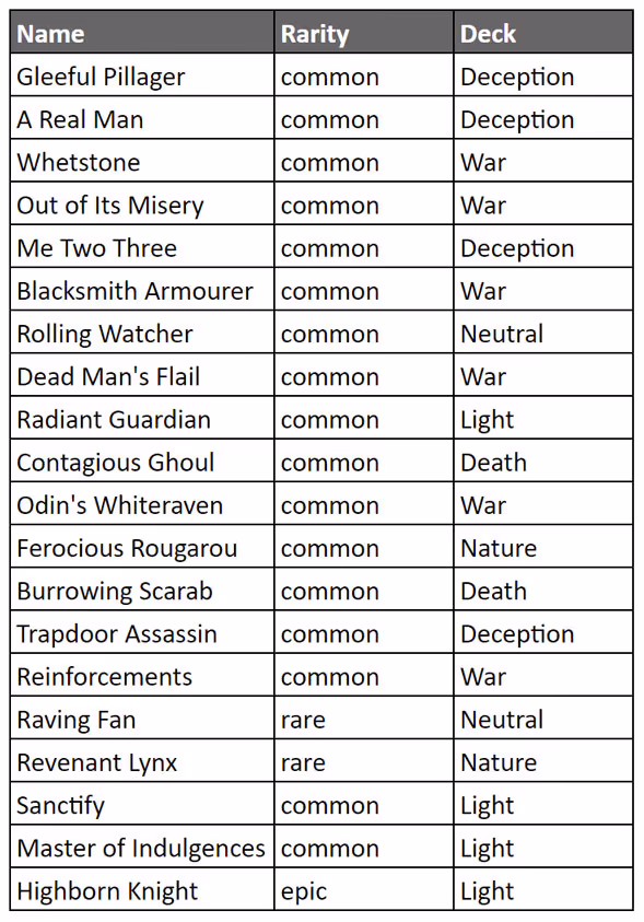 We weren’t kidding when we suggested a further drop in overall rarity: the single epic card that made the top 20 lists this time around was Highborn Knight, which forms part of multiple top-performing Light decks currently. It reached #20 and #6 across both weeks respectively.