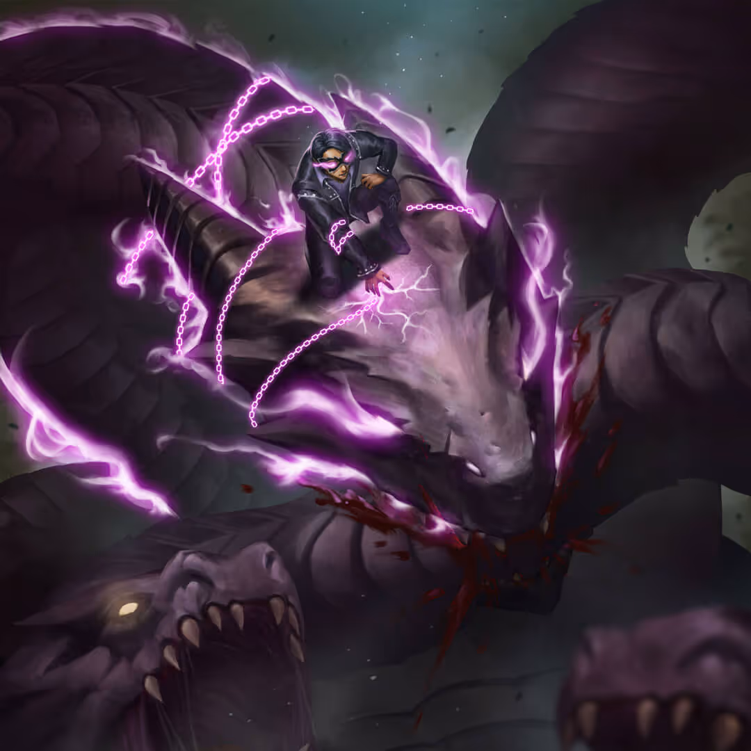 The head’s eyes glow purple. It seizes one of the other heads by the neck and sinks needle-sharp teeth into its throat, shaking and growling until that head goes limp. The others rear back and hiss and roar, but none of them will attack it back. They see the truth—that it is they, that they are it—and so they hesitate.