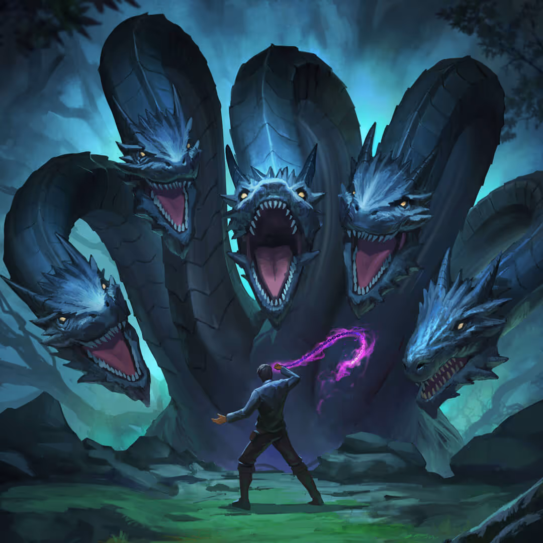 Even in a place as big as the Arkmonian Wood, finding the hydra posed no great challenge. Stopping for directions had practically been overkill. The creature is massive, the size of a cottage, with five necks as thick as treetrunks, ten keen eyes, and five sets of snapping jaws, any one of which could easily bite Orfeo in half. He knows not to cut its heads off—but he prefers more indirect methods, in any case.