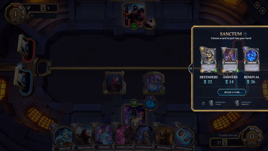 Favor is gained by making Favor actions during a match. Favor can then be spent to unlock temporary cards from the Sanctum during a match! For those mortals seeking their god's Favor in the Arena, follow these simple steps: