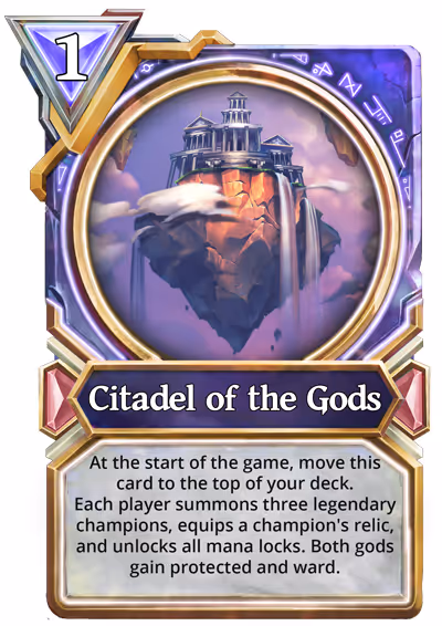 Descending from the heavens, Citadel of the Gods is a one-of-a-kind card that lets you play out a unique version of the Trial of the Gods story in a single match. Literally putting the "Mythic" in Mythic Draw, this is the ultimate prize to round out the first portion of Season 1: Champions Rise, but it can only go to one chosen mortal. For more, check out the announcement video to see the Citadel of the Gods in action.
