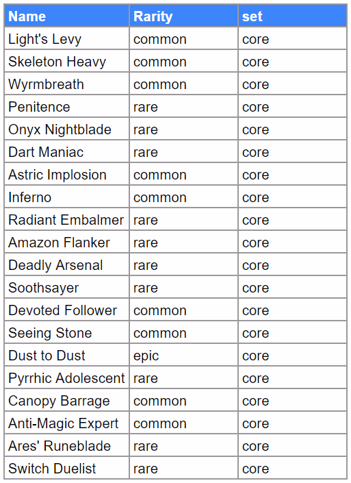 Skeleton Heavy is in hot pursuit at number two – are we ever surprised by its presence anymore? – and Wyrmbreath rounding out the podium. The three top core cards on the Marketplace serve as a good snapshot of the rest of the top twenty as well: Light, Neutral and Magic make up most of the list, (four, five and five cards each respectively, almost three-quarters of the top twenty) with War and Deception getting only two entries with Deadly Arsenal at #11 and Ares’ Runeblade at #19 for the former Anti-Magic Expert at #18 and Switch Duelist at #20 for the latter).