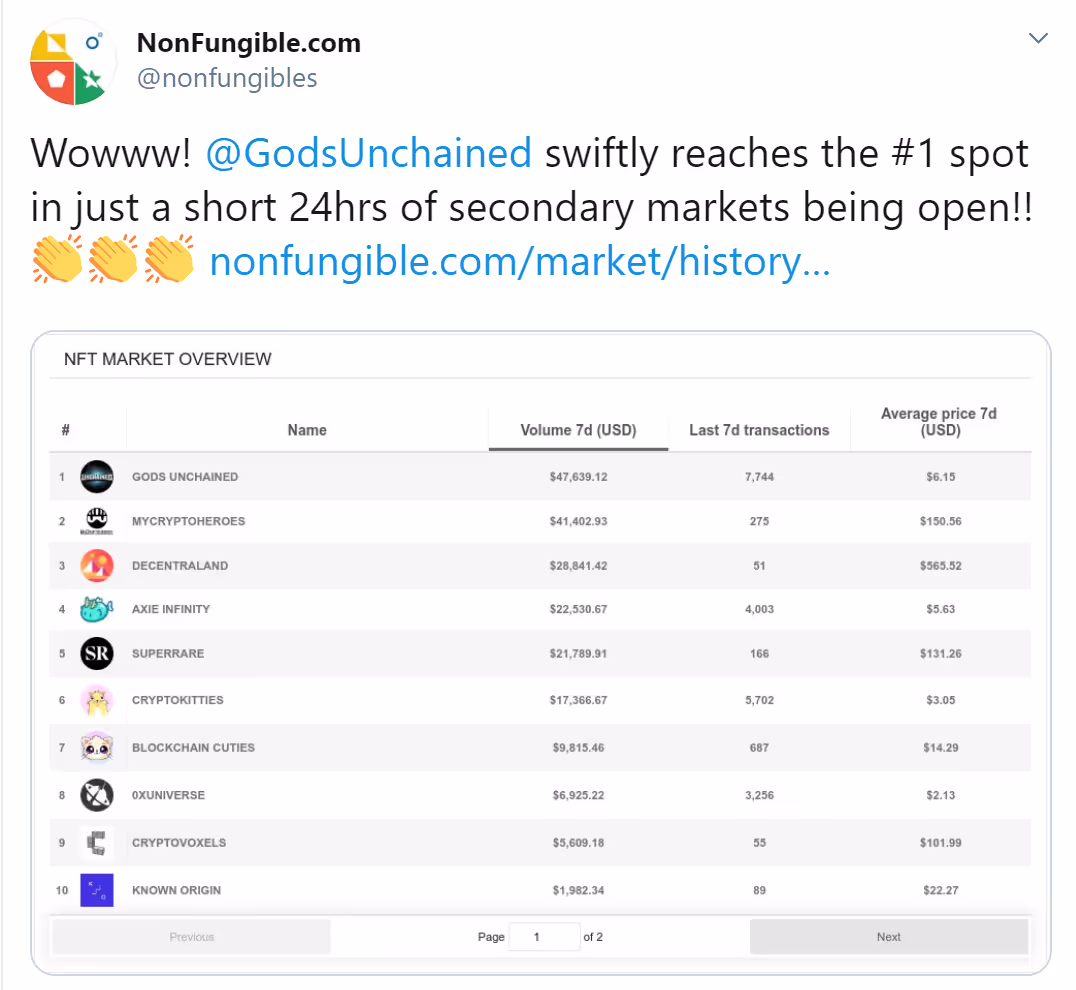 The tokenization of more than 6 million NFTs (Non-Fungible Tokens) also makes this the biggest-ever in the history of Ethereum games – in fact, more Gods Unchained cards were traded than every other card game put together that has ever existed on the blockchain.