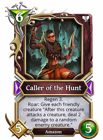 Apex Dad: As a Nature main, this Amazon card has been amazing. With many of the Nature cards being Confused, Caller of the Hunt allows you to create value out of attacks even if they do not hit the intended target. Did I already mention that Caller of the Hunt is an Amazon? This means it syncs up well with Myrto's Daughter or Arkmonian Onslaught.