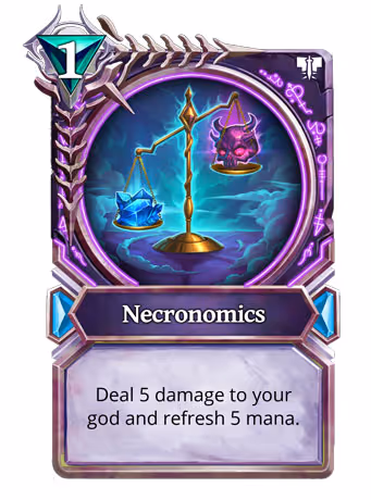 The first card that really got me excited about Trial of the Gods, and my personal favorite, is Necronomics. Right away I couldn’t wait to experiment with new Death decks. Upon release, I was struggling to make good use of it in the aggressive midrange or ‘15 health or less’ builds I had imagined it thriving in... until I skimmed over Faustian Pact while deck building. The stars aligned and before I knew it, I was flinging out 8+ cards in one turn and truly feeling like a God amongst mortals.