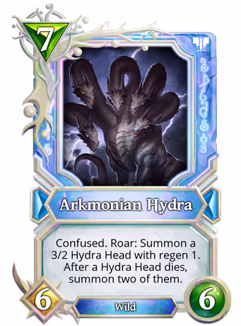 By far my favorite card from the new set is the five-headed beauty: Arkmonian Hydra. The two notoriously powerful 7 drops, Ashen Drake and Demogorgon, are perfectly parried by the Ark Hydra’s unique set of skills. As a 6/6 creature, the body stands large enough to survive either an Ashen or Demo and, in fact, both cards actually end up with downsides due to the (3/2) Hydra Head’s ability to duplicate if it is killed by the randomness of the Ashen or Demo.