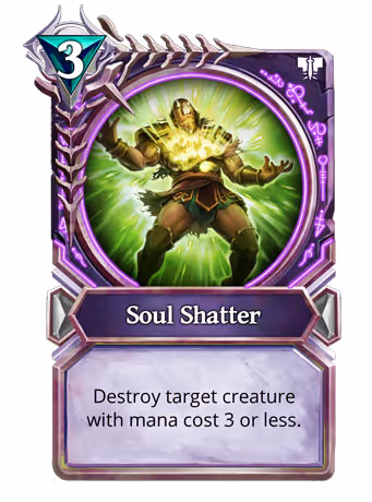 themudman: With the announcement of the October 28th balance patch, Soul Shatter has quickly become one of my favorite cards. On the 28th, the card was buffed. Now Soul Shatter is a 3 mana spell that destroys a creature with mana cost 3 or lower. A 3 mana spell that takes out a Black Jaguar, or a Pyramid Warden sounds sort of “meh”, but this card really shines when creature buff cards, like Canonize, and Out of Its Misery, are prevalent on the ladder.